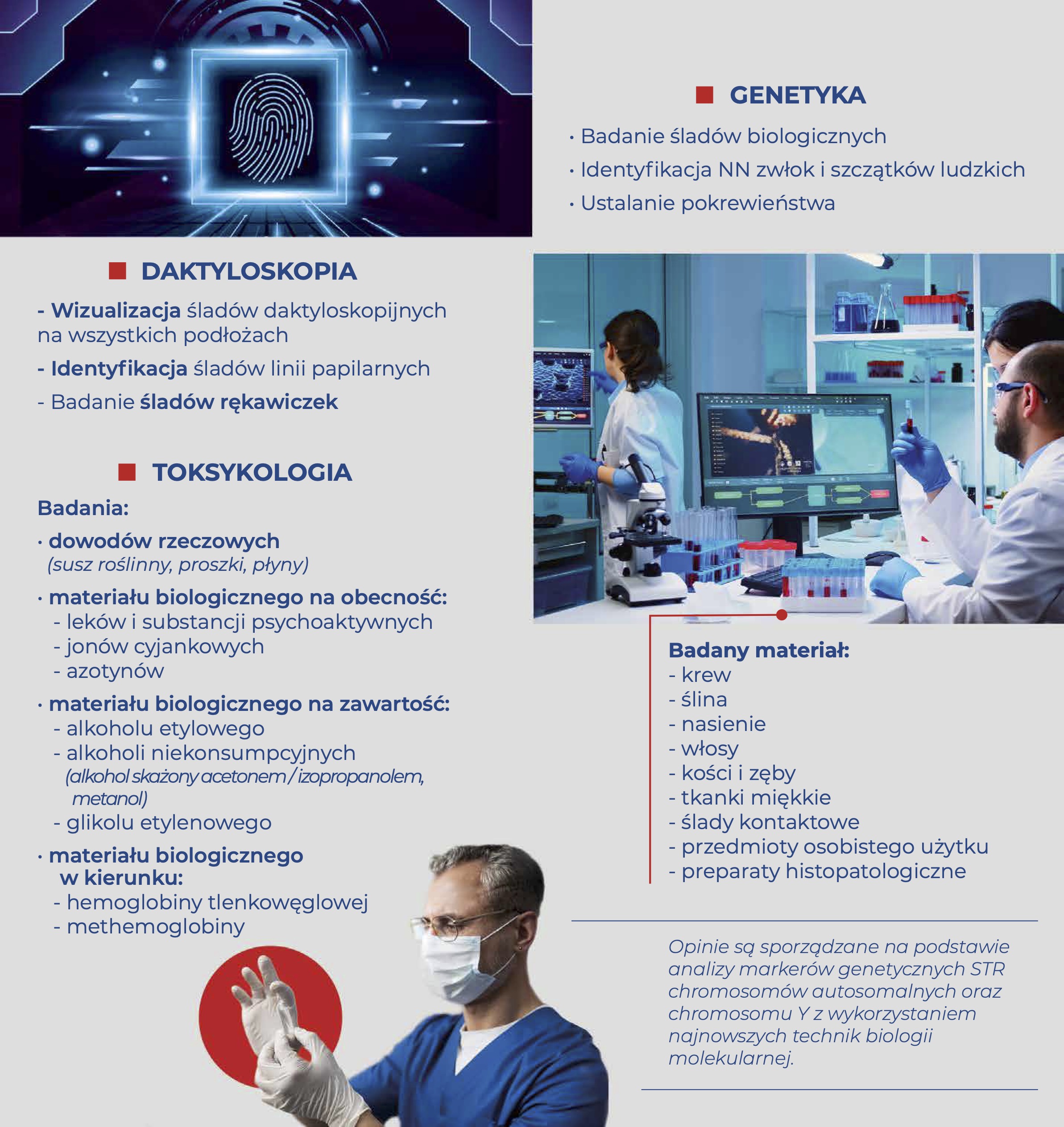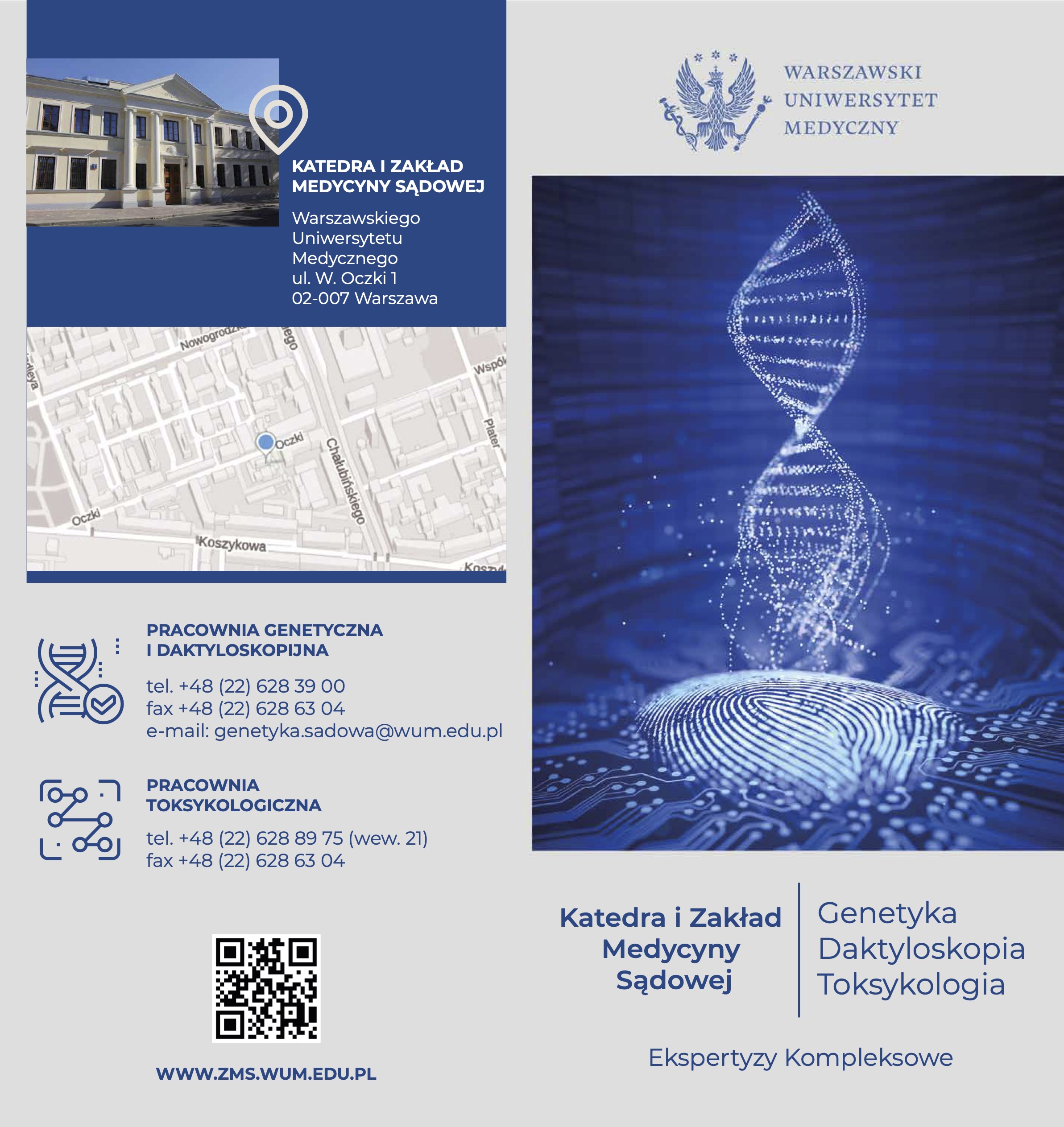 Zapraszamy do zapoznania się z ulotką odnośnie ekspertyz kompleksowych (tj. genetyka, daktyloskopia, toksykologia) dostępne w KiZMS WUM.
