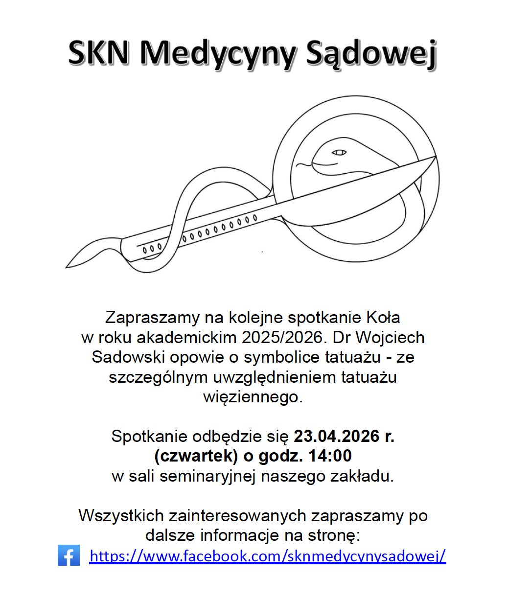 Wszystkie osoby zainteresowane działalnością naukową w polu medycyny sądowej i chętne do działalności w Kole proszone są o kontakt z Zakładem.